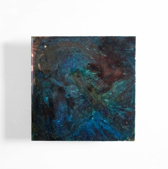 Water II is a collection of patinated copper squares that nod to 20th century color field paintings. The process involves soft materials placed on copper and left to react for different lengths of time. A chemical reaction is used to create abstract hazes, which take on a different expressive character when integrated with the earthy and raw forms. The overall quality is reminiscent of peering into the depths of the oceans.